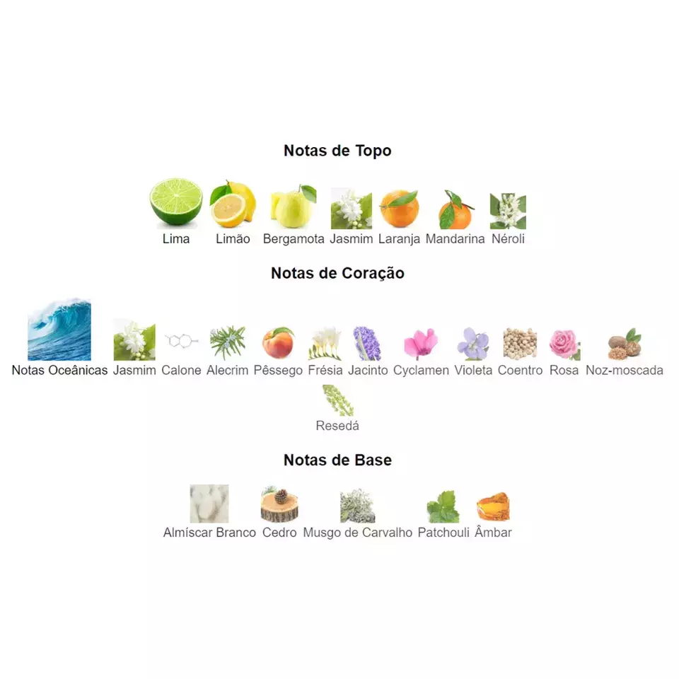 As notas de coração são: Notas Oceânicas, Jasmim, Calone, Alecrim, Pêssego, Frésia, Jacinto, Cyclamen, Violeta, Coentro, Rosa, Noz-moscada e Resedá.
