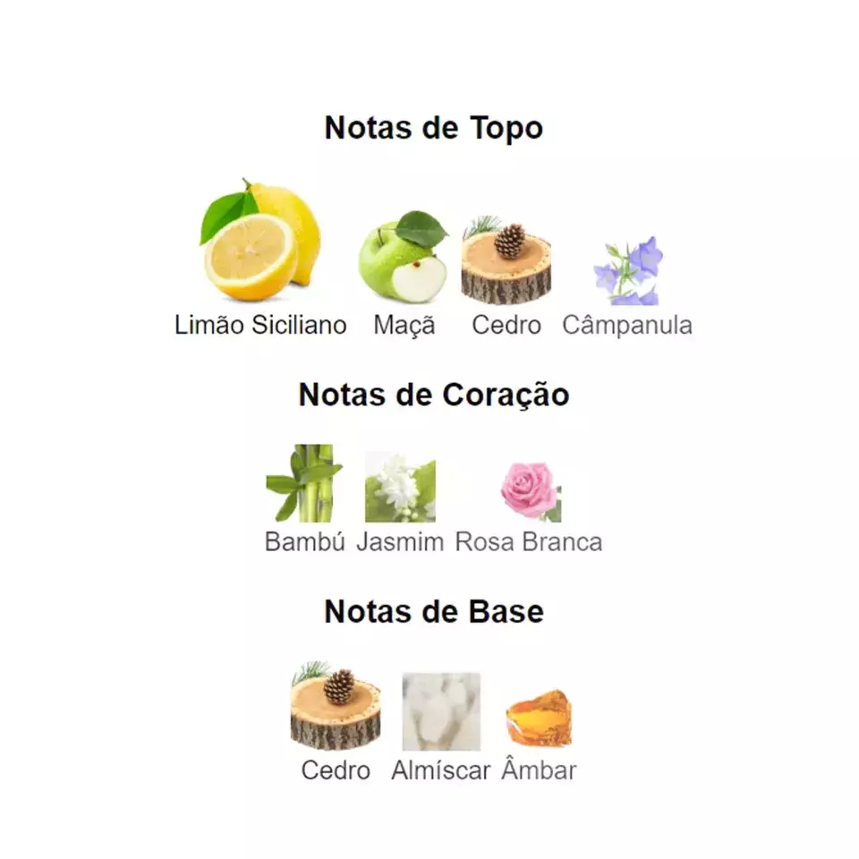 As notas de topo são: Limão Siciliano, Maçã, Cedro e Câmpanula.