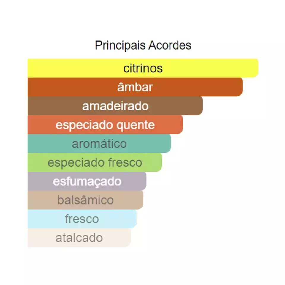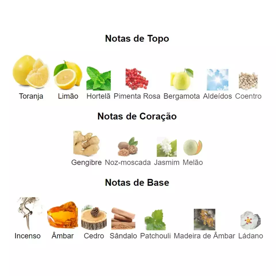 As notas de topo são: Toranja, Limão, Hortelã, Pimenta Rosa, Bergamota, Aldeídos e Coentro.