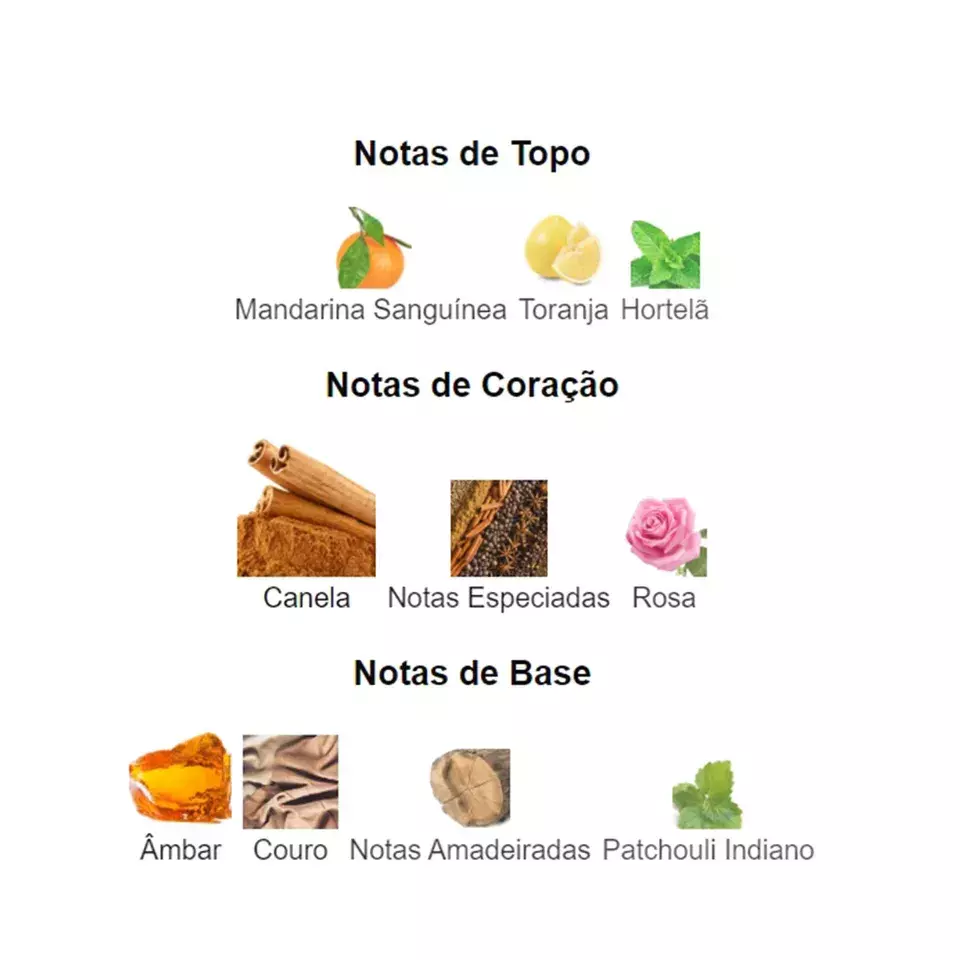 As notas de topo são: Mandarina Sanguínea , Toranja e Hortelã.