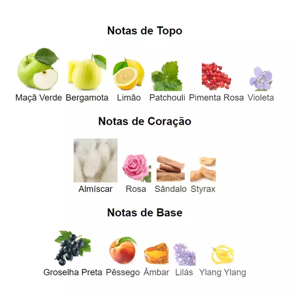 As notas de topo são: Maçã Verde, Bergamota, Limão, Patchouli, Pimenta Rosa e Violeta.