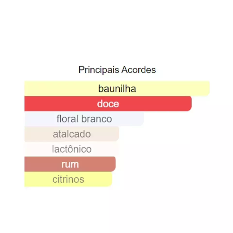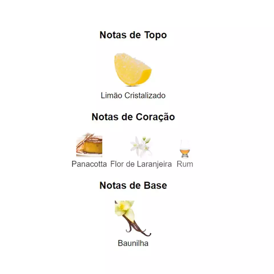 As notas de coração são: Panacotta, Flor de Laranjeira e Rum.