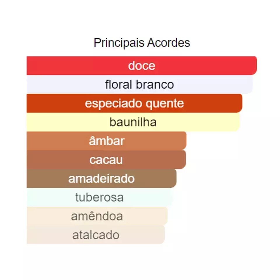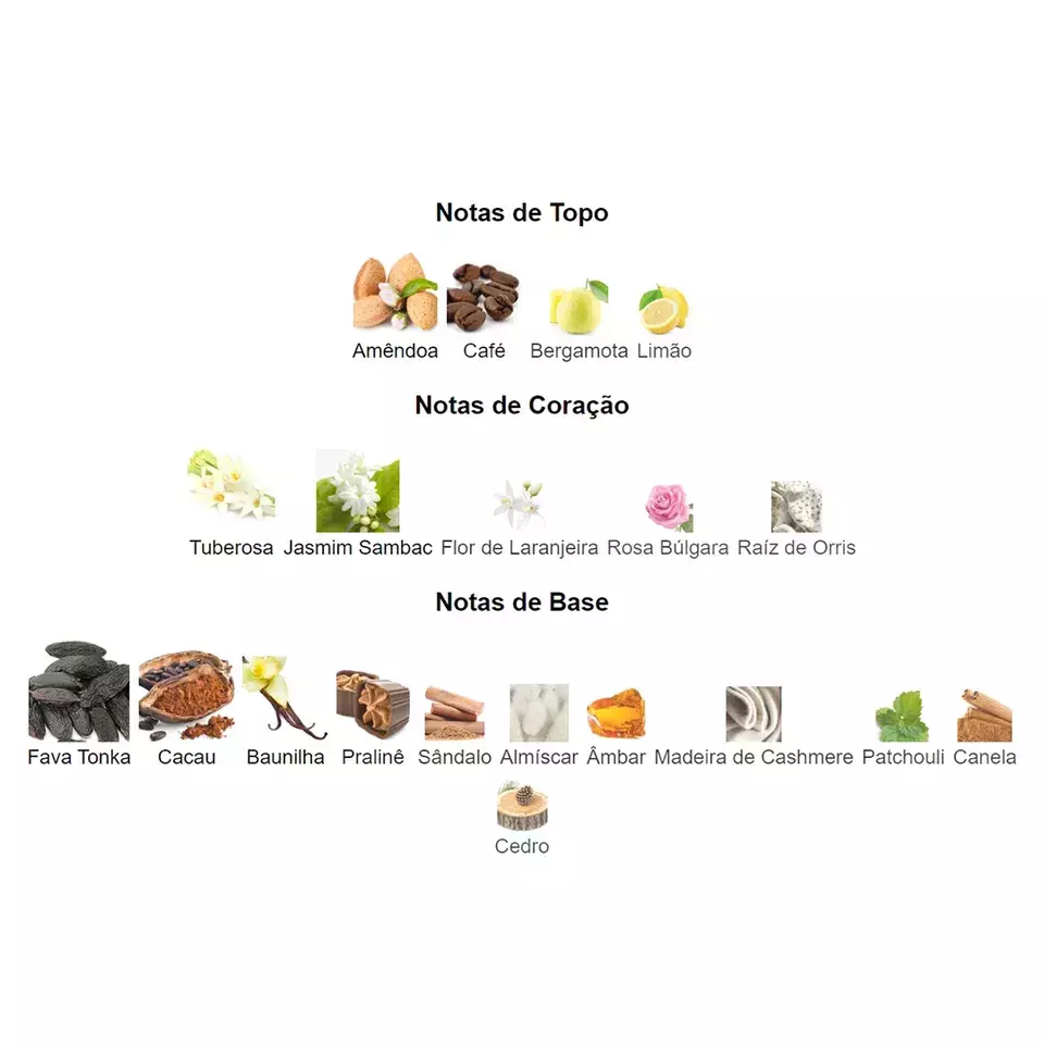 As notas de fundo são: Fava Tonka, Cacau, Baunilha, Pralinê, Sândalo, Almíscar, Âmbar, Madeira de Cashmere, Patchouli, Canela e Cedro.