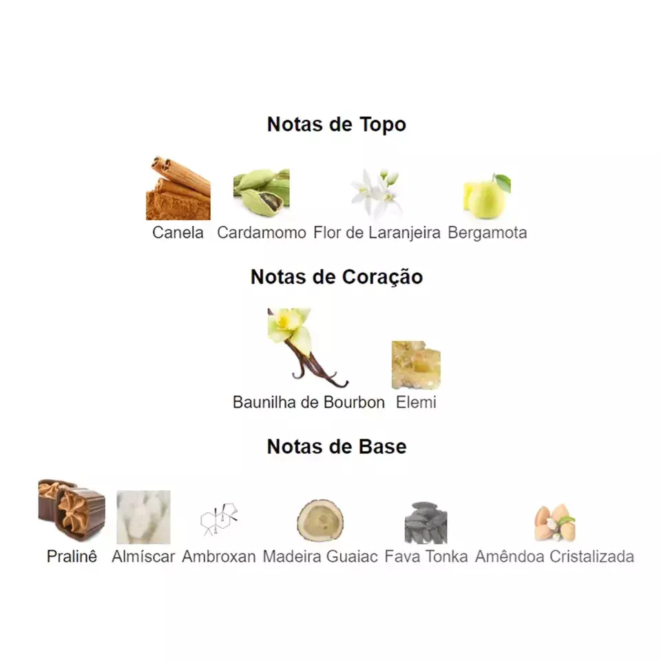 As notas de fundo são: Pralinê, Almíscar, Ambroxan, Madeira Guaiac, Fava Tonka e Amêndoa Cristalizada.